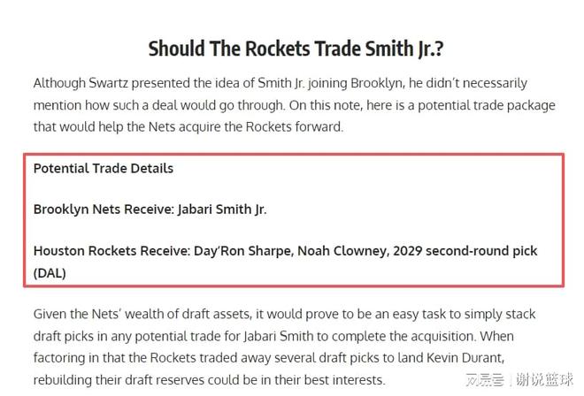 媒体FW就策划了火箭跟篮网进行交易,从具体方案来看,前探花贾巴里-史密斯或许会被火箭送走。然而如果用他只是换来两替补戴龙-夏普和诺阿-克罗尼,再加上一个2029年次轮选秀权的话,火箭这边甚至略微亏了点。